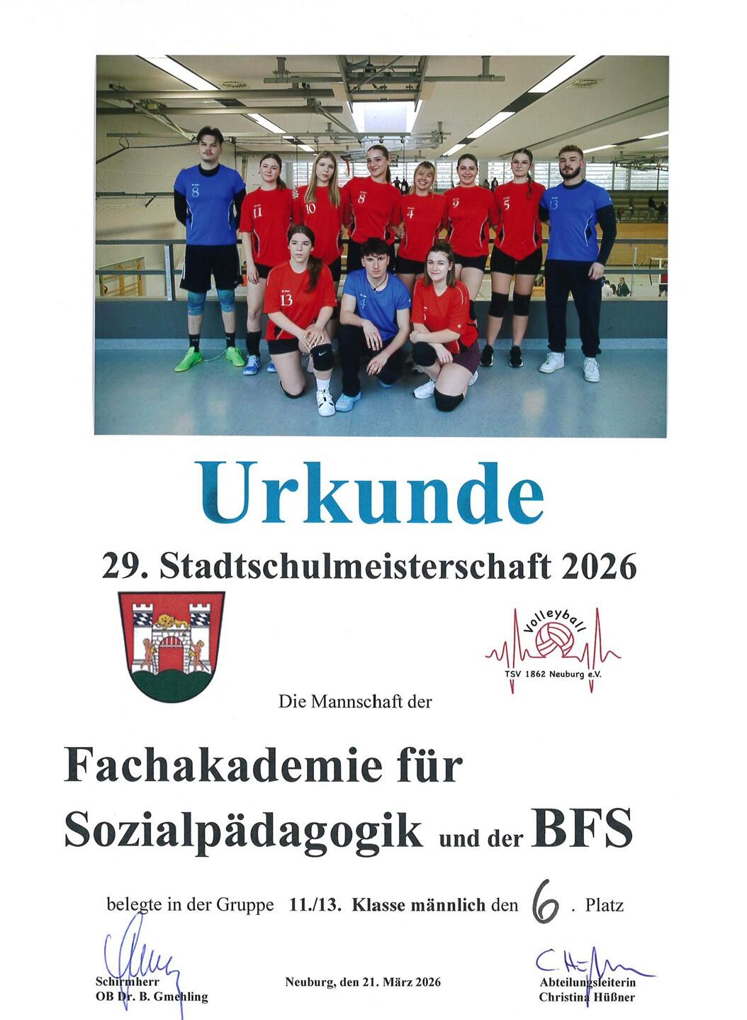 Am Samstag, den 21. März 2026, fand erneut die Stadtschulmeisterschaft im Volleyball statt. Unsere Schule, die BFS/FAKS, war mit einer weiblichen sowie einer gemischten Mannschaft vertreten. Betreut wurden die Teams von Frau Eberhardt und Herrn Stegmeir.