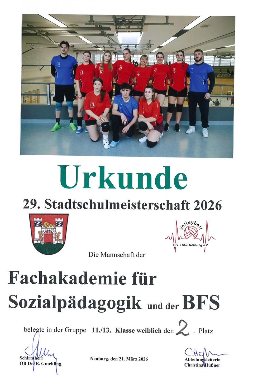 Die Damenmannschaft erreichte einen hervorragenden 2. Platz, während sich die gemischte Mannschaft in der Männerkonkurrenz einen respektablen 6. Platz sichern konnte. Besonders schön war zu sehen, wie der Sport Schülerinnen und Schüler aus unterschiedlichen Bildungsgängen miteinander verbindet: Die Teams setzten sich aus Klassen der Fachakademie, der Berufsfachschule für Kinderpflege sowie dem Sozialpädagogischen Einführungsjahr zusammen.