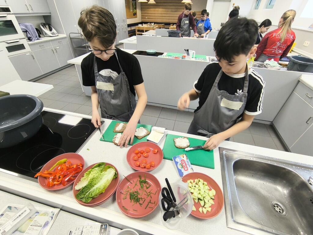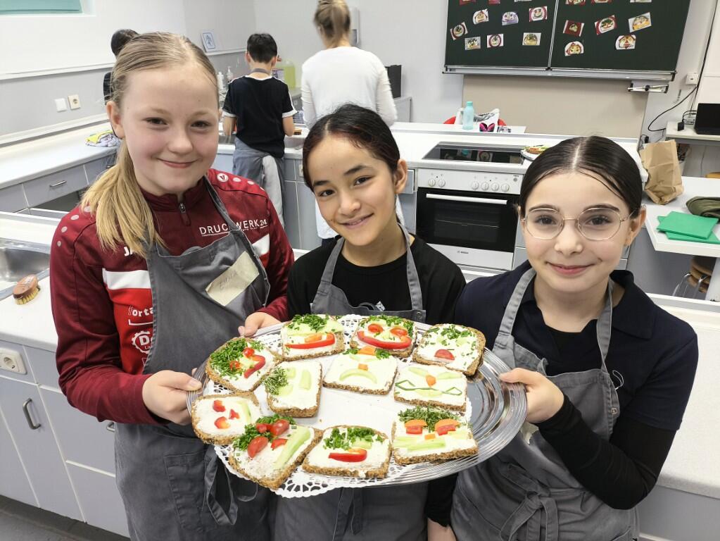Unter Anleitung von Frau Eberhardt bereiteten die Schülerinnen und Schüler kreative „Gesichter-Pausenbrote“ zu. Mit viel Fantasie wurden aus Brot, Gemüse und weiteren gesunden Zutaten lustige und farbenfrohe Brotgesichter gestaltet. Dabei lernten die Kinder nicht nur den Umgang mit Lebensmitteln und Küchengeräten, sondern auch, wie sich eine gesunde und ansprechende Pausenverpflegung zubereiten lässt.